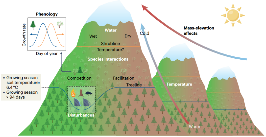 通过梳理文献资料,中国科学院青藏高原研究所生态系统格局与过程团队梁尔源研究员等明晰了全球高山树线与灌木线的分布格局,系统总结了山体效应、温度、水分、种内和种间作用、物候期以及干扰等对高山树线和灌木线形成的影响机制。在全球、半球和区域尺度上,展示了19世纪以来树线和灌木线的移动速率、树木和灌木生长、更新趋势及其权衡关系。同时,概括了树线和灌木线未来的变化情况,并论述过渡带扩张对高山生态系统的影响。近日,《自然综述-地球与环境科学》期刊在线发表了这一成果。