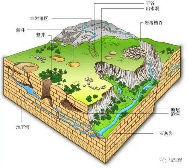 喀斯特地貌在碳酸盐岩地层分布区最为发育。该区岩石突露、奇峰林立,常见的地表喀斯特地貌有石芽、石林、峰林、喀斯特丘陵等喀斯特正地形,溶沟、落水洞、盲谷、干谷、喀斯特洼地等喀斯特负地形;地下喀斯特地貌有溶洞、地下河、地下湖等;以及与地表和地下密切相关联的竖井、芽洞、天生桥等喀斯特地貌。